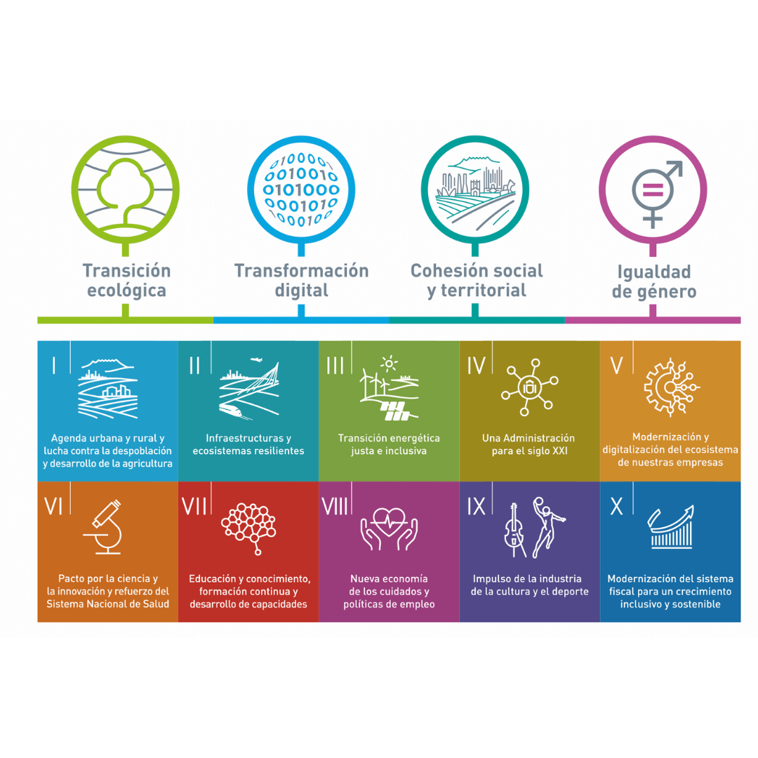 La quinta política es la modernización y digitalización del ecosistema de nuestras empresas, a lo que se destinarán el 17% de los fondos ante la necesidad urgente de apoyar el tejido empresarial y garantizar nuestra competitividad industrial.